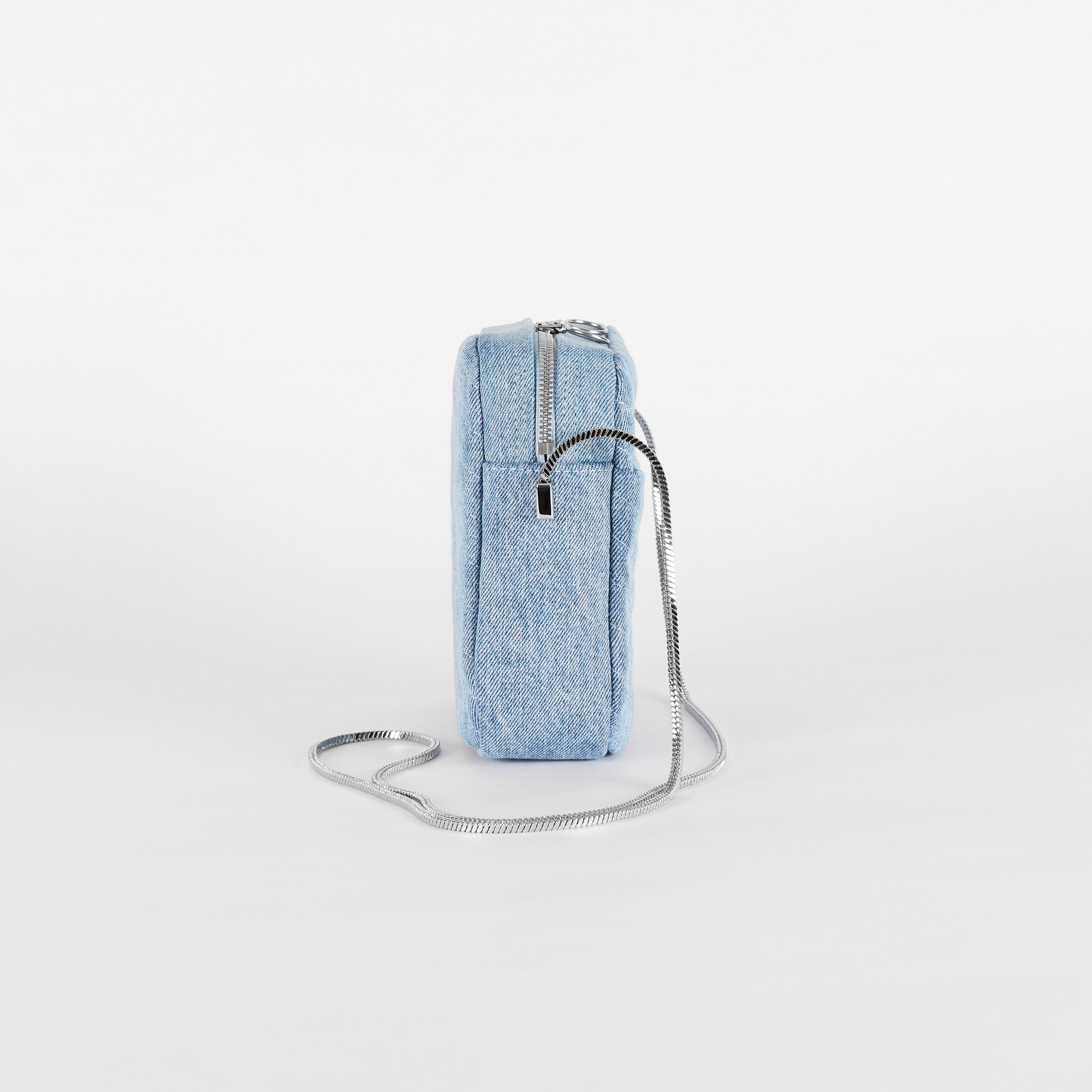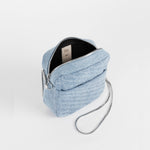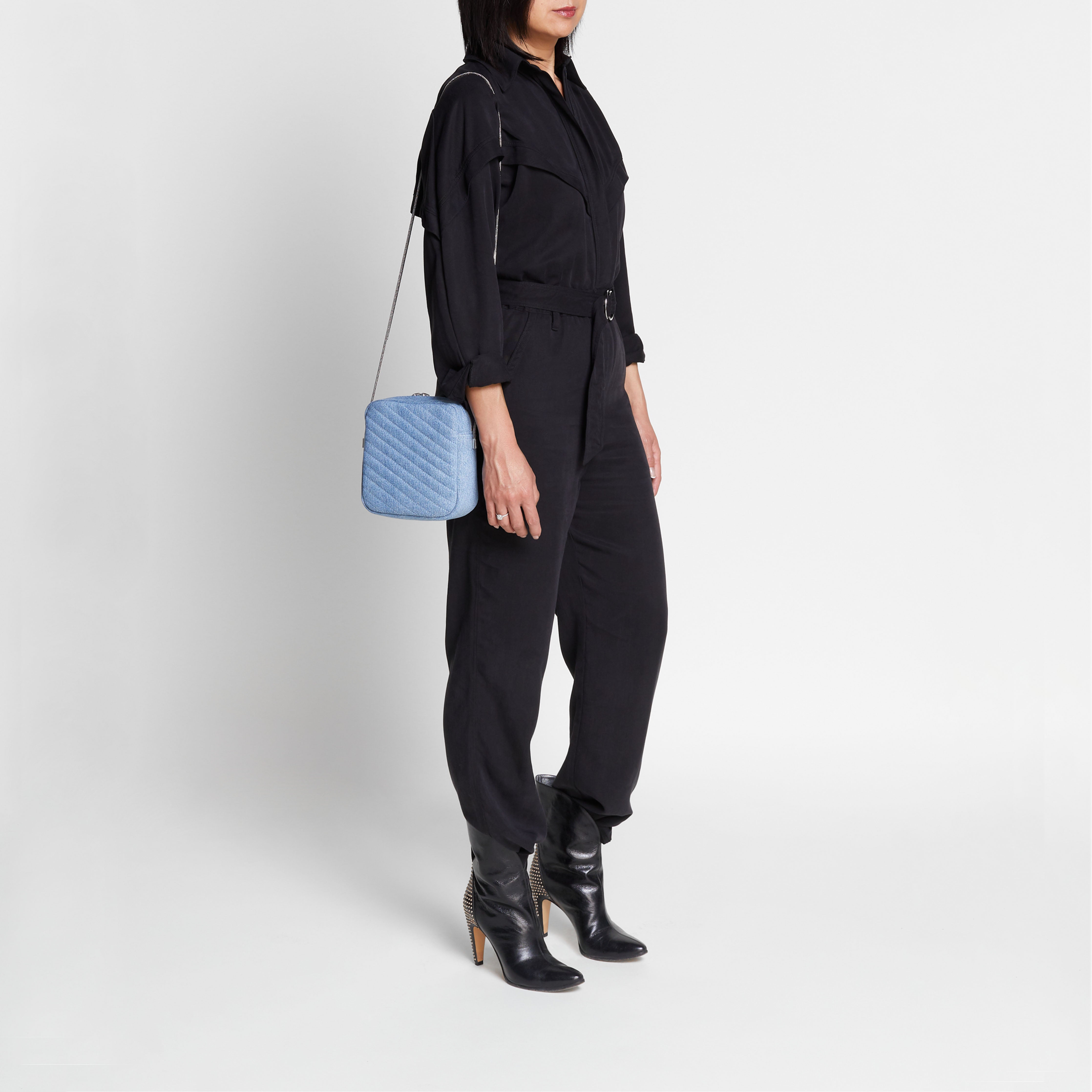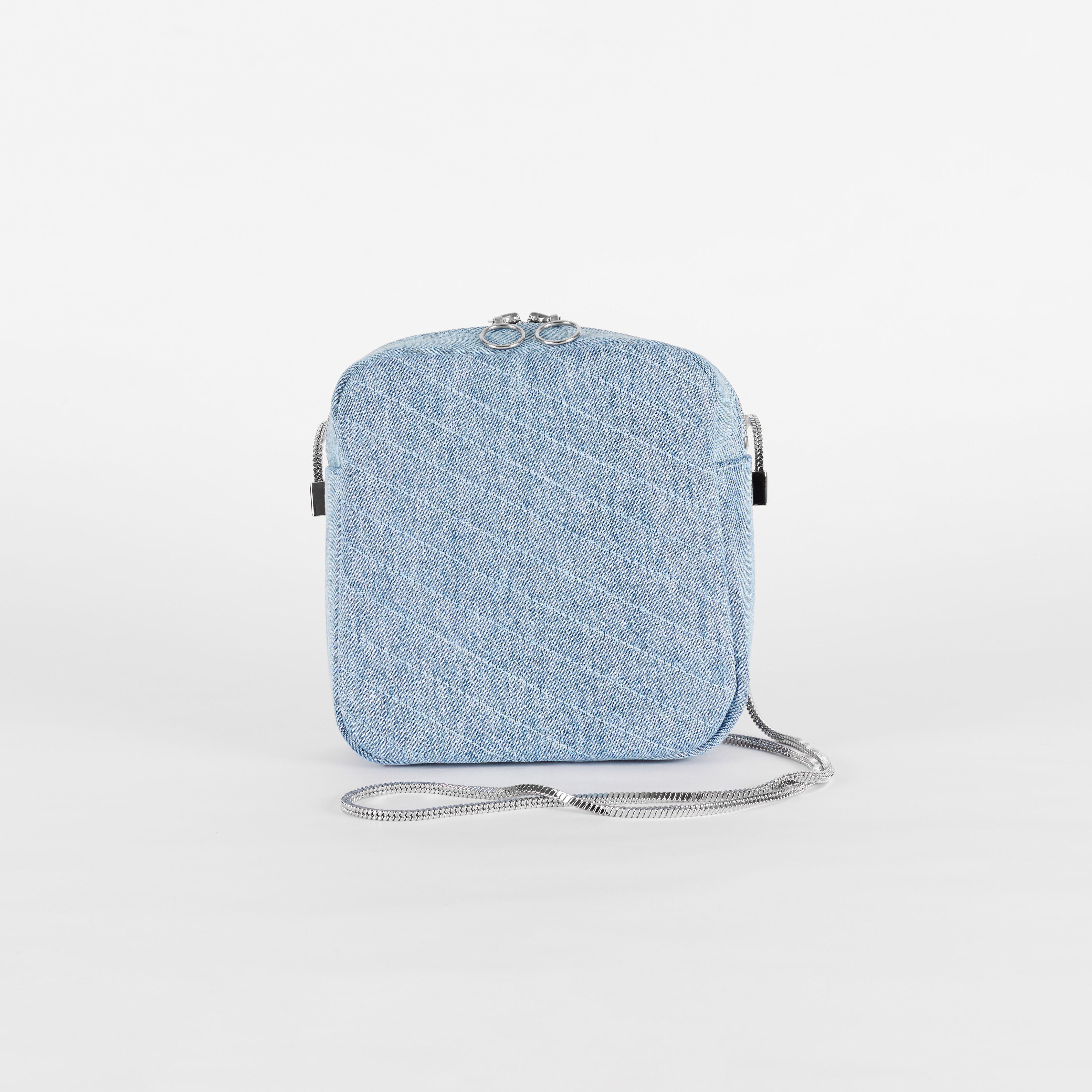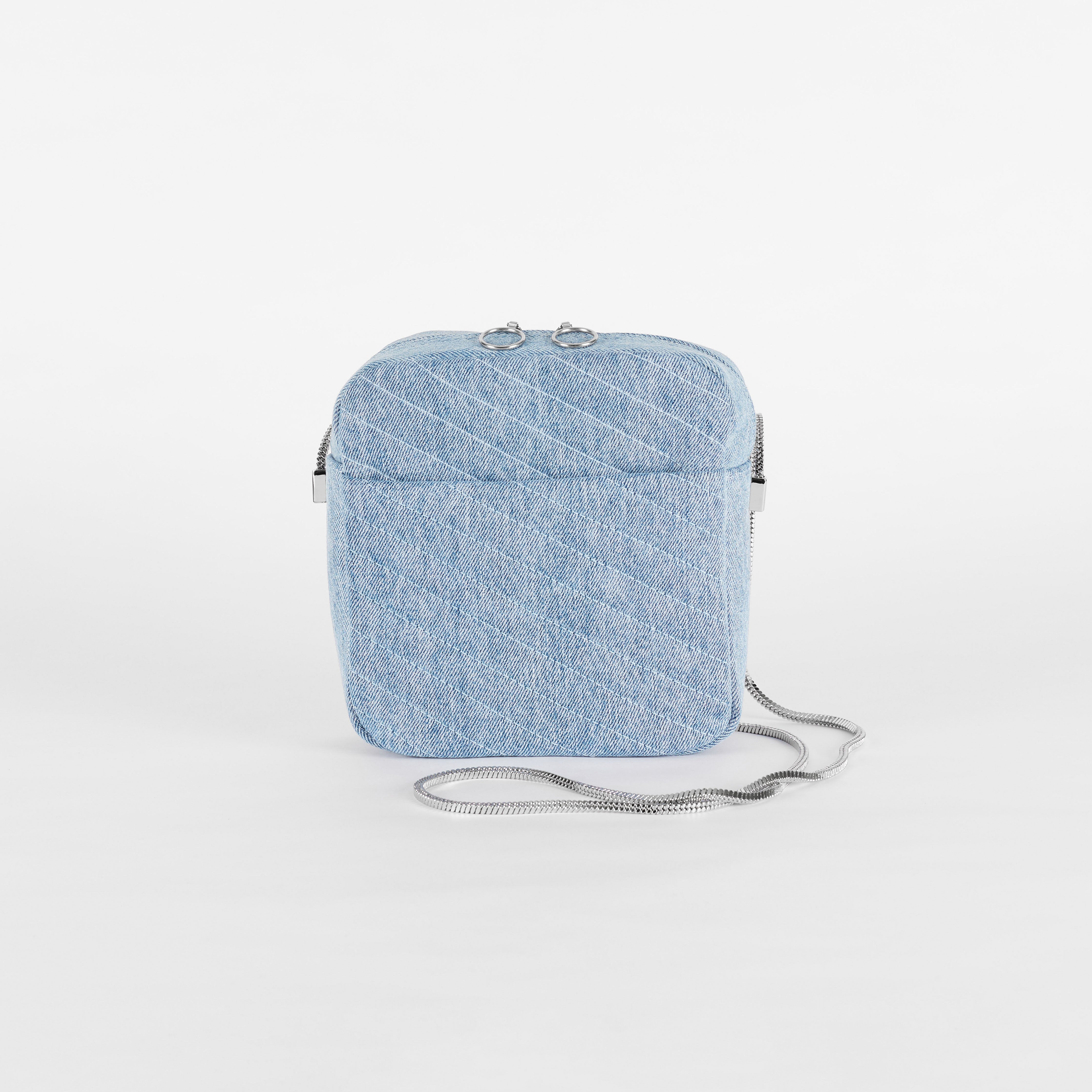 The Gabby camera bag is reimagined in our signature quilted denim. Crafted from repurposed jeans, this bag features an exterior pocket for easy phone access and an additional interior pocket to organize essentials, complemented by a lightweight silver-tone snake chain shoulder strap.
