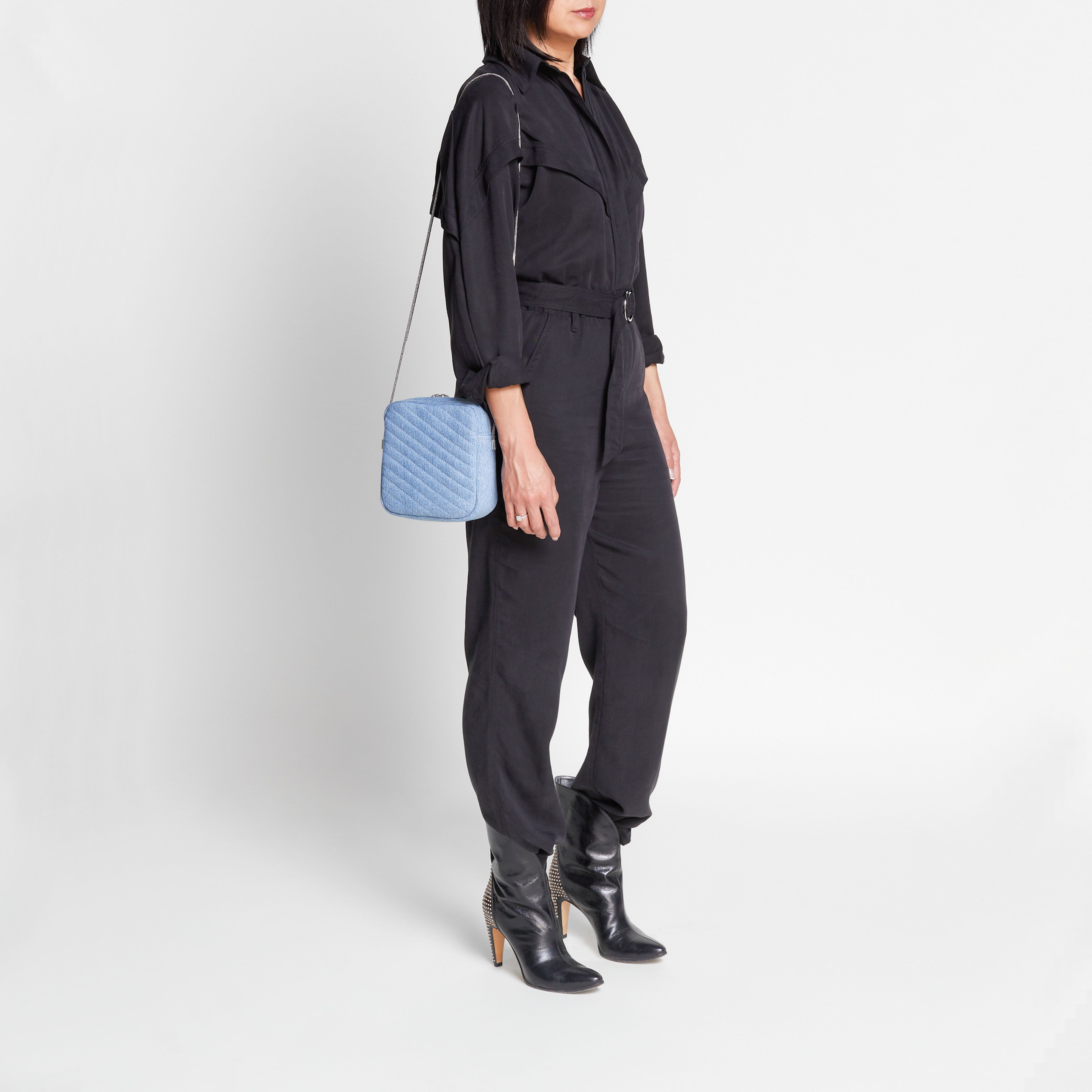 - Detachable self belt with silver tone hardware
