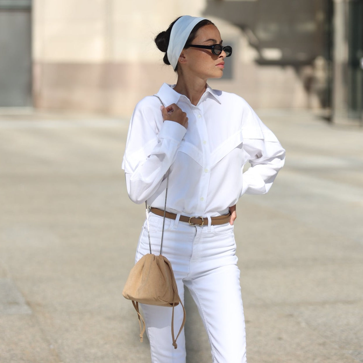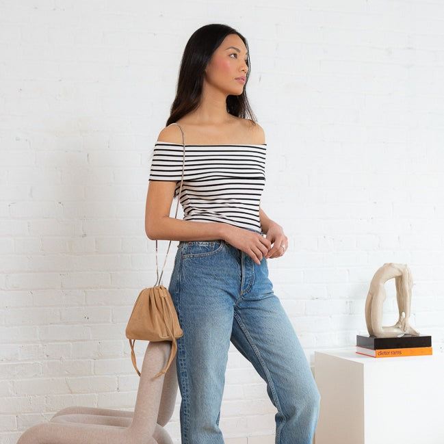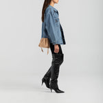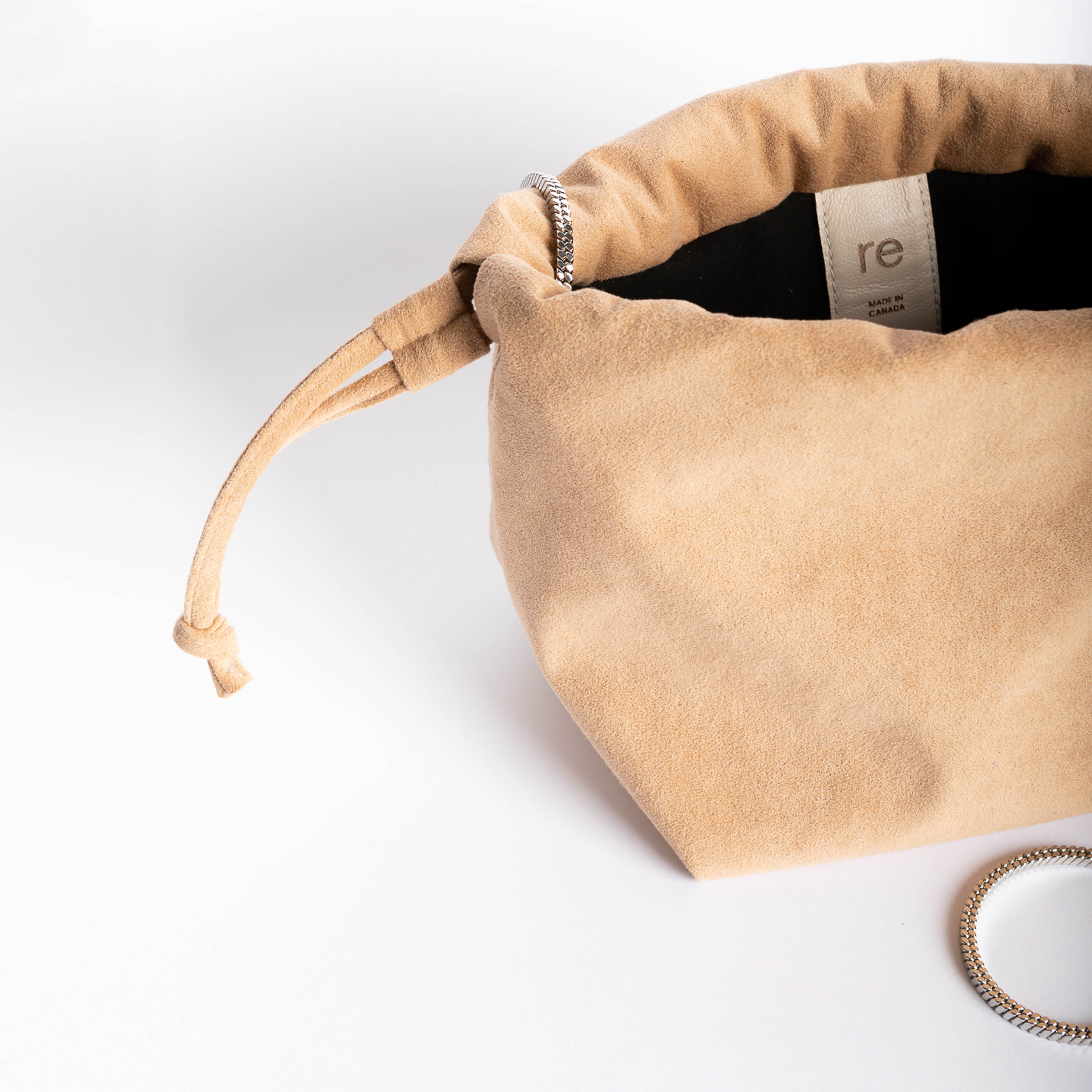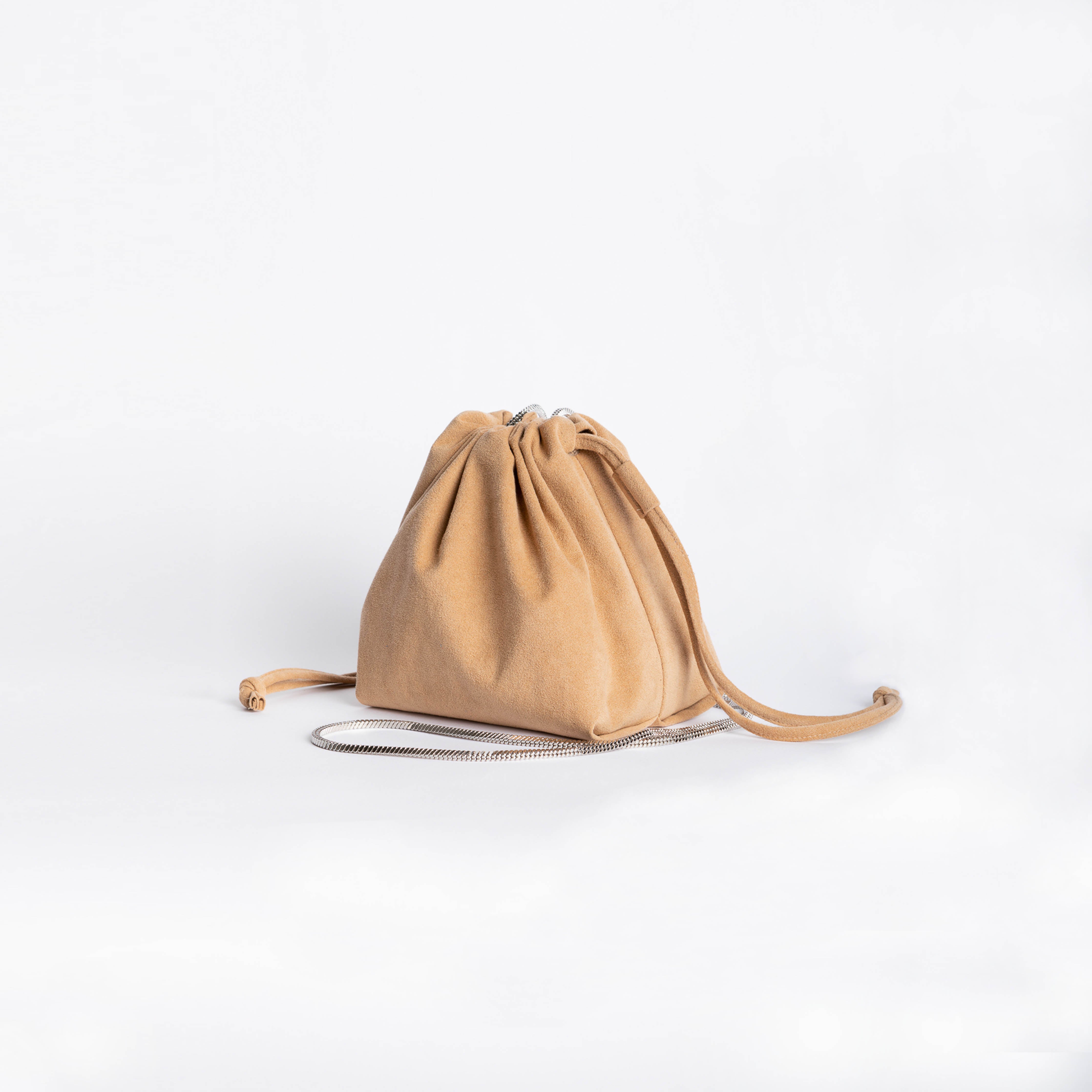 Crafted from premium vegan suede, the Carey Bag offers a minimalist approach on the timeless bucket bag design. It features a drawstring closure, complemented by a lightweight silver-tone snake chain shoulder strap.